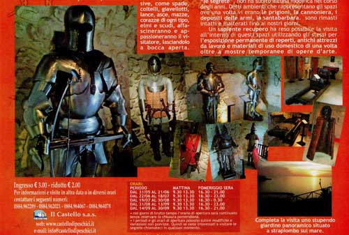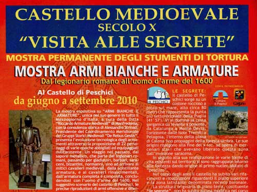 Clicca per Ingrandire In rassegna quest’anno, nelle Segrete del Castello di Peschici, armature e armi bianche con la mostra intitolata “Dal legionario romano all’uomo d’arme del 1600” (foto del titolo e 1 sotto, la locandina; ndr). Mostra dell’evoluzione tecnologica degli armamenti attraverso la proposizione di numerosi personaggi di varie epoche abbigliati ed equipaggiati militarmente.