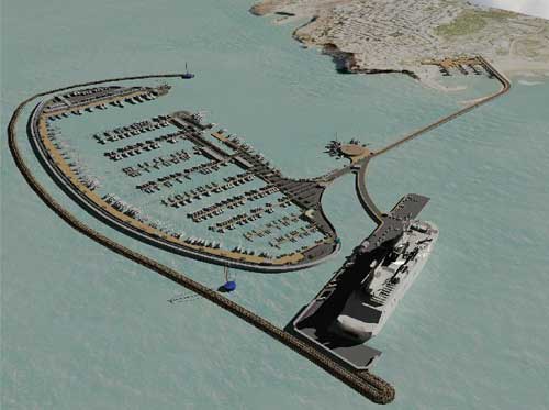 Clicca per Ingrandire La società “Prim Marina di Peschici srl” con sede in Torino ha presentato alla Regione Puglia la richiesta di concessione dello specchio d’acqua antistante il paese, con allegato progetto preliminare per realizzare un porto turistico da circa 900 posti. Il progetto è strutturato come un’isola in mezzo al mare collegata alla terraferma da una strada sia pedonale sia carrabile sorretta da piloni in maniera da consentire comunque il passaggio dell’acqua e delle correnti senza ostacolo alcuno in maniera da non incidere sulla linea di costa. La strada si collegherà al braccio già esistente in maniera da diventare una passeggiata lunga circa un chilometro, dalla marina al nuovo porto.