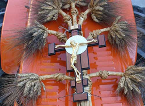 Clicca per Ingrandire Una lunga teoria di trattori, carretti addobbati con spighe di grano, bandiere gialle, girasoli e prodotti della terra ha riempito di colori e di allegria Carlantino per la “Festa degli Agricoltori”. A sfilare davanti ai mezzi agricoli, in mezzo a centinaia di persone che hanno partecipato all’evento, c’erano anche il sindaco Dino D’Amelio e il presidente di Coldiretti Puglia, Pietro Salcuni. Intenso e pieno di partecipazione il momento della santa messa all’aperto, davanti alla Cappella della Santissima Annunziata, con la benedizione di animali e trattori.