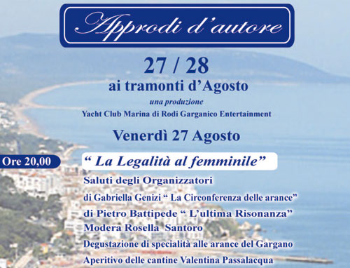 Clicca per Ingrandire Parlare di legalità al femminile e di turismo culturale sul Gargano durante gli splendidi tramonti d’agosto sulla Montagna Sacra: questo connubio fra cielo, mare, cultura, esperienze, ma anche lettura, degustazione di prodotti dal sapore antico come le arance di Rodi e di un buon calice di vino emergente della Capitanata, sarà il protagonista di “AppRODI d’Autore”, allo Yacht Club Marina di Rodi Garganico nel nuovo porto turistico “Maria Santissima della Libera”.