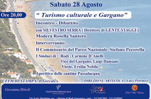 Sabato 28, ore 20: "Turismo culturale e Gargano", incontro-dibattito con Silvestro Serra, direttore di “Gente Viaggi”. Modera Rosella Santoro. Interverranno: il commissario del Parco Nazionale del Gargano, Stefano Pecorella, e i sindaci di Rodi Garganico, Vico del Gargano, Vieste - Aperitivo delle cantine Valentina Passalacqua