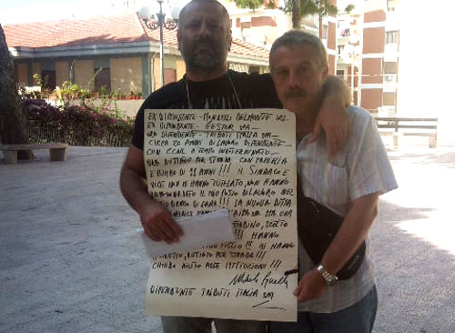 Clicca per Ingrandire 31 agosto 2010: è stato il giorno della verità per Michele Panella (foto del titolo, con Carmine Vassallo, vicecoordinatore nazionale Italia del Sud e Isole del Movimento Unione Nazionale; ndr), il dipendente di Tributi Italia di Rodi Garganico, l'agenzia di riscossione espulsa dal registro per decisione del Ministero dell'Economia. Panella da 189 giorni (oggi; ndr) svolge la sua pacifica protesta davanti al municipio della cittadina garganica, presentandosi regolarmente tutti i giorni, con un cartello appeso al collo, nel quale protesta contro la sua mancata riassunzione da parte della società - l'Aipa di Milano - che dopo la chiusura di Tributi Italia si è aggiudicata i servizi di riscossione per conto dell'Amministrazione di Rodi. Quasi tutte le amministrazioni colpite dal crack di Tributi Italia avevano inserito nelle gare d'appalto per l'affidamento del servizio clausole di salvaguardia, in modo che venisse garantita la prosecuzione del rapporto di lavoro dei dipendenti di Tributi Italia.