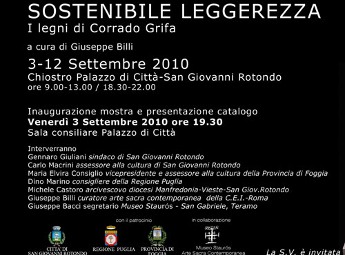 Clicca per Ingrandire Dal 3 al 12 settembre nel Chiostro Comunale del Palazzo di Città a San Giovanni Rotondo saranno in mostra le opere dello scultore Corrado Grifa. A occuparsi dell’esposizione sarà il Curatore di Arte Contemporanea della Cei (Chiesa Cattolica Italiana), Giuseppe Billi. “Sostenibile leggerezza - I legni di Corrado Grifa” è il titolo di questa mostra incentrata sul tema della leggerezza, proposta in anteprima a San Giovanni Rotondo. In tale occasione verrà presentato anche il nuovo catalogo dell’artista pubblicato dalle Edizioni Stauròs che contiene le opere esposte, i testi di presentazione del presidente della Regione Puglia Nichi Vendola, del vicepresidente della Provincia di Foggia Maria Elvira Consiglio, del sindaco di San Giovanni Rotondo Gennaro Giuliani, dell’assessore alla Cultura di San Giovanni Rotondo Carlo Macrini e i saggi critici di Giuseppe Billi (storico dell’arte e Curatore d’Arte Contemporanea della Cei-Roma), Marco Gallo (docente di Storia dell’arte moderna e contemporanea dell’Università “Lumsa” di Roma), Loredana Rea (docente di Storia dell’arte contemporanea all’Accademia di Belle Arti di Frosinone) e Marko Ivan Rupnik (artista e direttore del Centro di studi e ricerche “Ezio Aletti”-Roma).