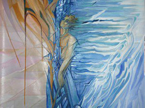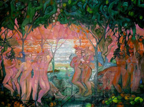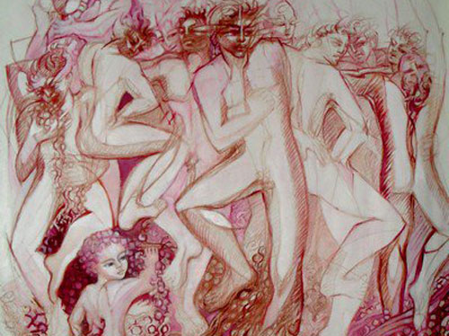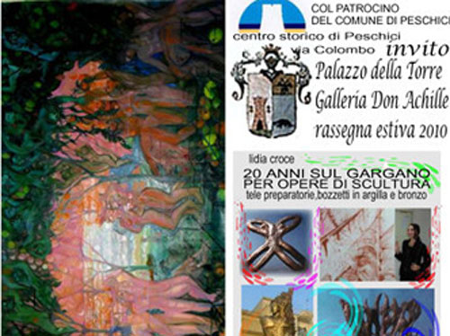 Clicca per Ingrandire Sorgono e si ergono da lussureggianti grappoli d’uva, quasi esalazioni bacchiche inebrianti e ubriacanti, cercando spazio in un enorme tino, i forti polpacci di maschi pigiatori. E’ il focus dell’ultima “sanguigna” (foto 2 sotto; ndr) di Lidia Croce (foto del titolo, accanto a un altro suo lavoro), in esposizione prossimamente nella Corte e nelle Antiche Sale del peschiciano “Palazzo della Torre” (Via Colombo, 29) con altre opere (foto 3-4) della pittrice-scultrice ormai peschiciana d’adozione e senese di residenza.
