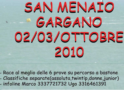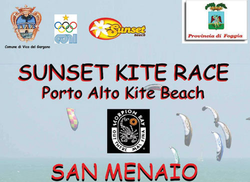 Clicca per Ingrandire Sarà lo splendido litorale di San Menaio, sul Gargano, la location individuata per ospitare il 2° Trofeo di Kitesurf Sunset Kite Race, la gara organizzata dall’associazione sportiva dilettantistica “Un mare di sport” di Ancona, col patrocinio del Comune di Vico del Gargano e il sostegno di più di 15 sponsor locali. Si tratta di una gara amatoriale, non agonistica, in programma il 2 e 3 ottobre nelle acque antistanti il Porto Alto Kite Beach di San Menaio, località sul litorale garganico che, per esposizione ed estensione, si presenta come “spot” ideale per chi vuole praticare kite, grazie alla sua spiaggia abbastanza lunga e libera di bagnanti in direzione Rodi.