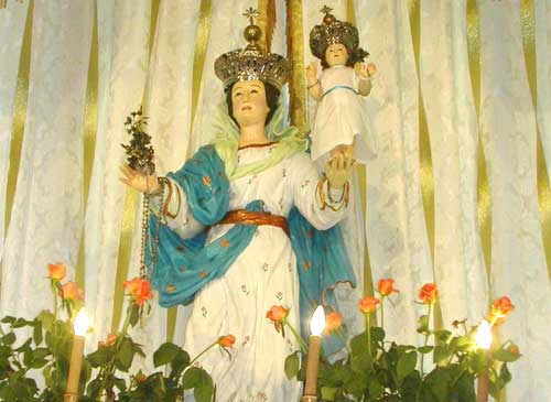 Clicca per Ingrandire Domani, prima domenica di ottobre, cade la festa dedicata alla Madonna del Rosario (foto del titolo; ndr), cui è intitolato il piccolo tempio del Purgatorio in Piazza del Popolo a Peschici dove il simulacro troneggia al centro dell'altare, organizzata dalla omonima Confraternita. Ricorda Maria Teresa Rauzino: “Nei giorni precedenti si recitava, e si recita tuttora, questa novena: ‘Del Rosario, o gran Regina / Figlia, Madre, Sposa eletta / Della Triade benedetta / Onoranza d'ogni età. // Il Rosario che ci desti / è corona di bellezza, / il Rosario è la salvezza, / dell'afflitta umanità’. Il Santo Rosario è considerato la preghiera prediletta della Madonna. Non è soltanto un ripetere tante volte Ave Maria e Padre Nostro. E’ un dialogo cuore a cuore con Maria. E’ una preghiera da meditare. E’, soprattutto, una preghiera da vivere”.
