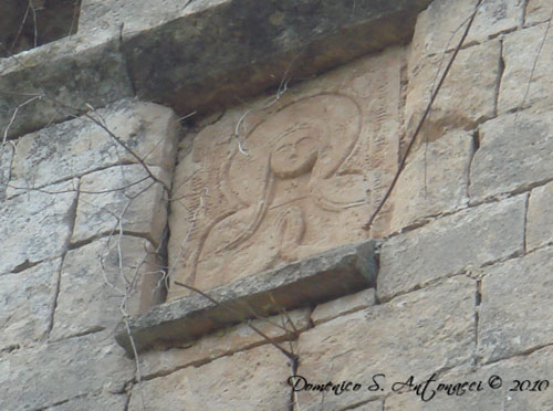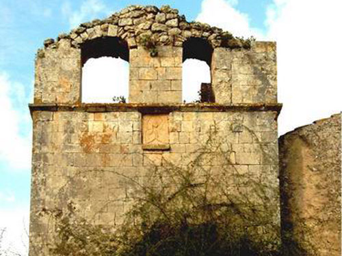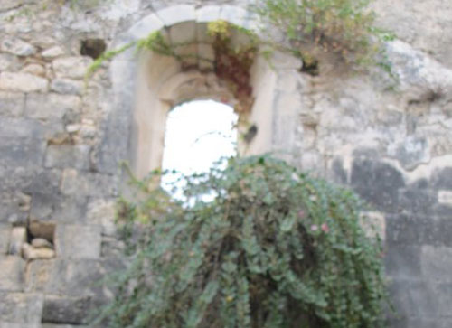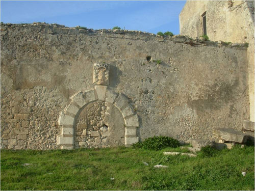 Se poi, oltre all'incuria, aggiungiamo il lento lavorìo degli agenti atmosferici e lo scorrere silenzioso e complice del tempo, non c’è che da attendere solo qualche anno e il “problema” verrà risolto alla radice. Perché Càlena non esisterà più! E' sotto gli occhi di tutti il danno che le piante di cappero (foto 3), con le loro pervicaci radici, e le diverse erbacce stanno operando sulle mura di cinta, già per altre cause sprofondate (foto 4). Ma soprattutto su ciò che rimane del campanile (foto 5), sotto le cui vele è incastonato un bellissimo bassorilievo raffigurante la Vergine orante (foto 6) che rischia di frantumarsi se non si interviene per tempo.