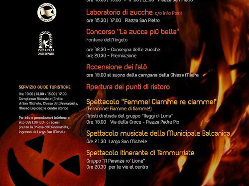Tutto comincerà alle 10 del mattino, con l’attivazione del servizio gratuito di guide turistiche (info 0881-96.49.04) per quanti vorranno visitare la Grotta di San Michele, l’Abbazia di Sant’Angelo, il museo e il centro storico. Nel pomeriggio, grandi e piccini potranno imparare a intagliare le zucche per trasformarle in lanterne dalle sembianze umane.