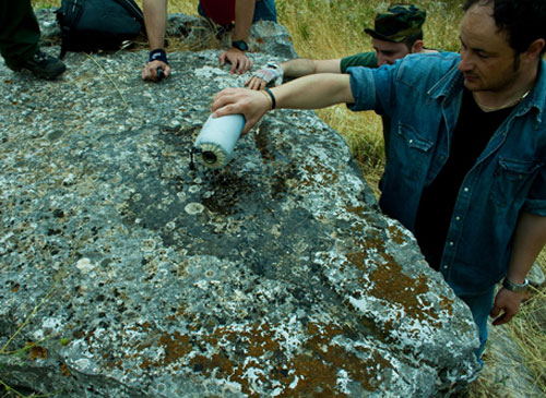 Molto interessante è la canalizzazione artificiale presente sulla lastra di copertura, che fa scorrere l'acqua su un preciso punto della struttura (abbiamo noi stessi sperimentato il fenomeno versando dell'acqua – foto 3). Probabilmente serviva per far scorrere i liquidi biologici del corpo del defunto una volta posto sul tetto del Dolmen. Ma passiamo agli orientamenti, che prima di noi nessuno aveva mai né considerato né studiato. La bisettrice dell’edificio in pietra, e la sua apertura, sono orientati verso Est, più precisamente a 110° E, valore misurato con una bussola magnetica, quindi rappresenta l’azimut magnetico (angolo orizzontale in senso orario tra l’oggetto osservato ed il Nord magnetico rispetto all’osservatore). Non è corretto basare il calcolo azimutale solo sulle misure magnetiche, a causa di eventuali anomalie nel campo terrestre.