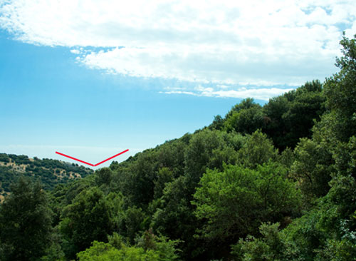 Per ottenere l’azimut geografico (quindi riferito al Nord geografico, che si discosta dal Nord magnetico) ho sottratto 1° 48’ (declinazione magnetica riferita al luogo e all’anno di osservazione) a quello precedentemente ritrovato, ottenendo un valore finale di 108° 12’ (foto 4). Questo significa che il Dolmen “guarda” in una direzione posta a circa 8° dal punto preciso dell’Est (90° E). Ma la chiave di tutto sta nel particolare panorama antistante la struttura. Due fianchi collinari, posti a distanze differenti rispetto al punto di osservazione (cioè rispetto al Dolmen), si “intersecano” all’orizzonte disegnando una sorta di “V” (foto 5). Inizialmente pensavo che l’apertura del Dolmen fosse in linea con essa, ma la “V” è risultata essere orientata a 100° E, azimut magnetico (98° 12’ di azimut geografico).
