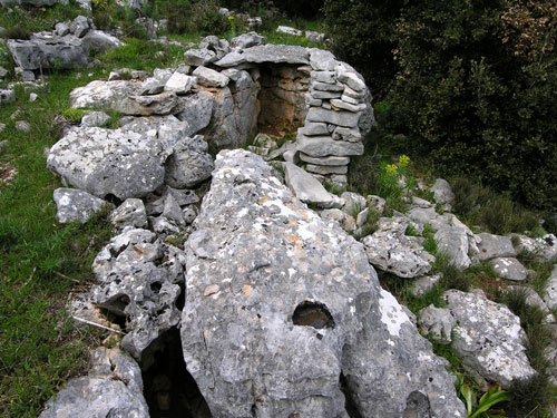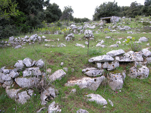 A poche decine di metri di distanza, si erge un’altra struttura. Ai lati presenta due enormi blocchi calcarei (più grandi della costruzione precedentemente descritta) a forma di Dolmen, parzialmente interrata e quasi del tutto priva di copertura. Sul lato destro si notano delle aggiunte, forse più recenti, costituite da piccole pietre incolonnate che chiudono in parte la costruzione (foto 7). Sembra essere un Dolmen a corridoio (strutture che presentano una camera sepolcrale ed un corridoio di accesso rettilineo, generalmente sono più recenti di quelle semplici). Nonostante sia visibilmente rovinata, presenta una caratteristica intrigante: quella che si suppone essere l’apertura, è orientata a 100° E (quindi 98° 12’ in azimut geografico), proprio verso la “V”.