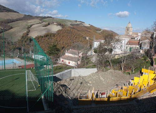 L’ANFITEATRO – Se prima era solo un sogno, ora l’anfiteatro all’aperto di Alberona va prendendo forma e lo stato di avanzamento dei lavori è sempre più evidente (foto 1 sotto). L’ultimo sopralluogo effettuato sul cantiere dal sindaco Giambattista Forgione ha permesso di constatare che gli interventi di realizzazione dell’opera procedono senza intoppi e secondo programma. La struttura, che sarà pronta entro l’estate 2011, sta sorgendo nelle immediate prossimità del complesso comunale polivalente del Villaggio Arancione, ai piedi del campo di calcetto e di fronte alla piscina (foto 2). L’anfiteatro sarà dotato anche di camerini e spogliatoi.