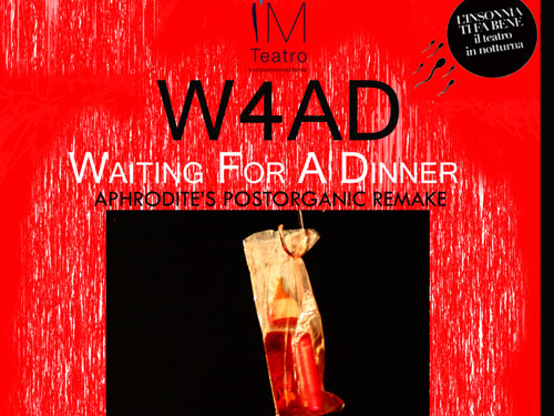 Clicca per Ingrandire “L'inadeguatezza dell'individuo di fronte a una società onnivora e spietata, schiacciato da un sistema massmediatico che influenza e determina comportamenti sociali, considerazione dell'io e sua continua tensione a essere ‘in forma’, adeguato… appetibile...”: lo spettacolo rientra in un piano di produzione per una trilogia. La seconda produzione, il “R4AD – Requiem For A Dinner”, è in lavorazione ed è stato selezionato per una “Residenza sotto Tutoraggio” curata dalla Compagnia “Bottega degli Apocrifi”. La Residenza si svolge nel Teatro Comunale di Manfredonia, all'interno del circuito “Teatri Abitati” della Regione Puglia (per informazioni si può consultare il sito della Bottega degli Apocrifi: http://www.bottegadegliapocrifi.it/index.php?view=details&id=68%3Awaiting-for-a-dinner&option=com_eventlist&Itemid=20).