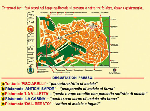 Ogni quartiere prepara un falò diverso per tema, forma e grandezza, partecipando all’assegnazione dei diversi premi (foto 1 sotto). Il gruppo autore del falò più bello si porta a casa niente meno che… un maiale intero. Dopo il tour della giuria, alle 17, i fuochi cominceranno a illuminare il borgo e prenderanno il via le degustazioni. Ai visitatori sarà consegnata una mappa (foto 2) che li guiderà attraverso i punti in cui si potranno gustare le diverse pietanze: il pancotto con fritto di maiale, la pampanella di maiale al forno, pasta e rape condite con pancetta soffritta di maiale, carne di maiale alla brace e infine cotica di maiale e fagioli.