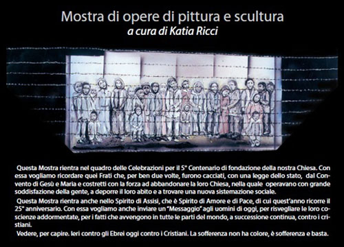 Clicca per Ingrandire Da domani, "Giorno della Memoria", 27 gennaio (inaugurazione alle 19) al 10 febbraio saranno esposte nella Cripta di San Ciro della chiesa di Gesù e Maria in Foggia le opere di pittura e scultura dell’artista sammarchese Nick Petruccelli incentrate sulla Shoah a ricordare l’olocausto del popolo ebraico. La Mostra, curata da Katia Ricci, visitabile dalle 17 alle 20 (per le scuole: dalle 10.30 alle 12.30), rientra nel quadro delle Celebrazioni per il 5° Centenario di Fondazione della chiesa a ricordare quei Frati che per ben due volte furono cacciati con legge di Stato dal Convento di Gesù e Maria e costretti con la forza ad abbandonare il tempio, in cui operavano con grande soddisfazione della gente, deporre l’abito e trovare una nuova sistemazione sociale.