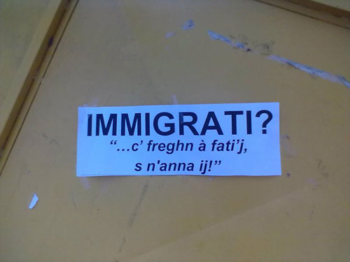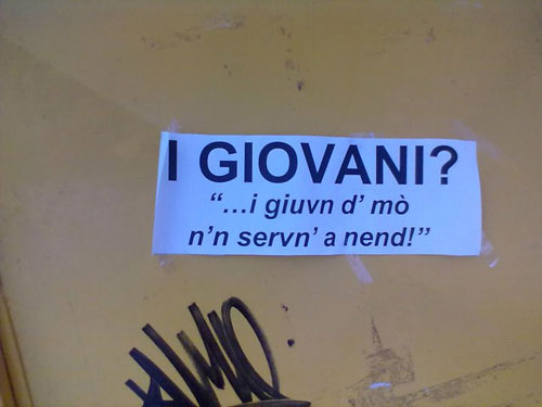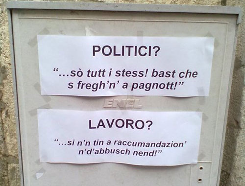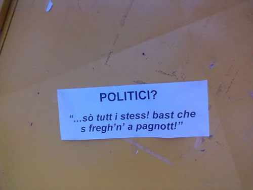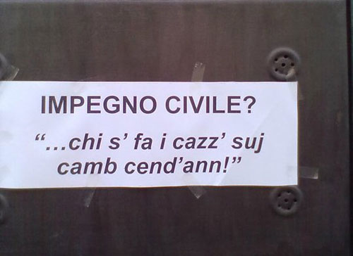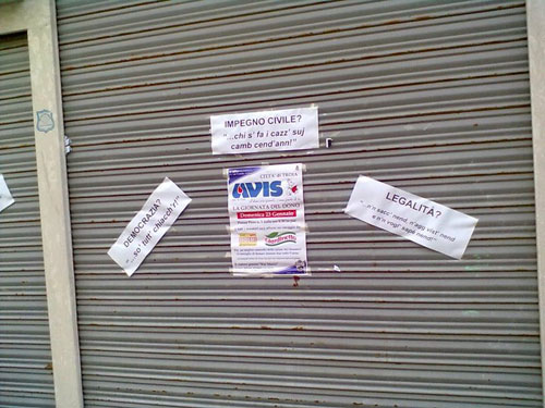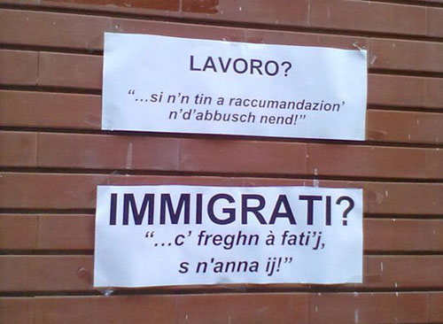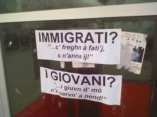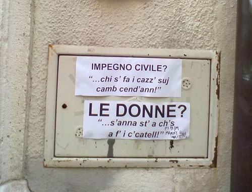 Le frasi erano del seguente tenore: “DEMOCRAZIA? So' tutt' chiacch'r!”, “IMPEGNO CIVILE? Chi s’ fa i cazz’ suj camb cend'ann!”, “POLITICI? So' tutt ugu'l! Bast che se freghn’ a pagnott’!”, “LAVORO? Si n'n tin a raccumandazion' n’n t’abbusch nend!”, “IMMIGRATI? C’ freghn u lavor, se n'anna ij!”, “LE DONNE? S’anna st’ a ch’s a f’ i c’catell!”, “I GIOVANI? I giuvn d'ogg n’ servn’ a nend!”, “OMOSESSUALI? Meglj’ ladr’ che r’cchión’”, “DIFFERENZIARE E RICICLARE? Ij a munnezz' a v'k a j’tt a Fogg!”, “LEGALITÁ? N’n sacc’ nend, n’agg vist’ nend e n’n vogl’ sapé nend!” (vedi foto).