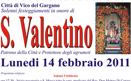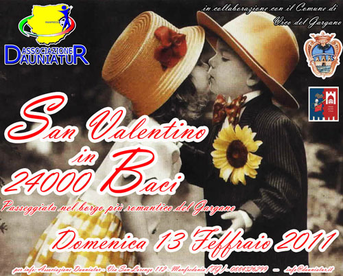 FESTA DEGLI INNAMORATI = L’Associazione manfredoniana “Daunia TuR” (foto 2, il logo) comunica che dal 13 al 17 febbraio si svolgono a Vico del Gargano i festeggiamenti in onore di San Valentino, patrono della città e protettore degli agrumeti dell’Oasi Garganica. Il giorno della festa degli innamorati vicoli e piazzette del centro storico si vestono a festa con addobbi di arance, limoni e foglie di alloro per accogliere frotte di giovani in amore. Una secolare tradizione racconta che mangiare le arance benedette dal patrono San Valentino e berne il succo esaudisca tutti i desideri di gioia e felicità come una miracolosa pozione d’amore. Uno scorcio tipico del centro storico porta il suggestivo nome di “Vicolo del bacio”, strettissima viuzza di solo 50 cm di larghezza che garantisce dolci effusioni e facili contatti.