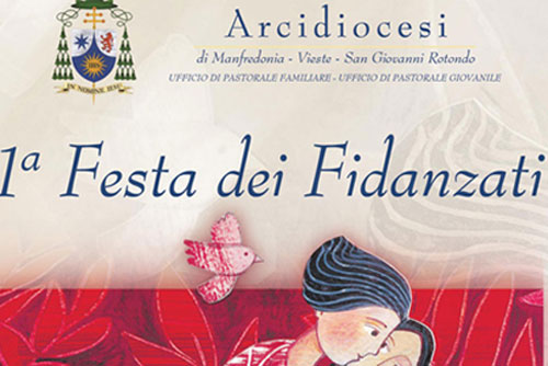 La Chiesa Diocesana di Manfredonia-Vieste-San Giovanni Rotondo, su volere di mons. Castoro e su impegno dell’Equipe Diocesana di Pastorale familiare e giovanile, ha dato vita a una nuova esperienza: “La Festa Diocesana dei fidanzati” (foto 3). La scelta della data, simbolica, che potrebbe variare nei prossimi anni, coincide con la vigilia della tradizionale festa dell’Amore di San Valentino. Le motivazioni di questo nuovo appuntamento sono molteplici. Nella Lettera Pastorale il vescovo Castoro ricordava: “Siete chiamati a vivere il sacerdozio come sposi e spose, pur tra difficoltà, nella fedeltà e nella reciproca donazione. Vivrete la vostra sessualità come liturgia dei corpi, si da poter arrivare ad unire eros ed agape, cioè l’amore inteso come passione con l’amore inteso come oblazione, sacrificio, per esser coppia, icona della Trinità”.