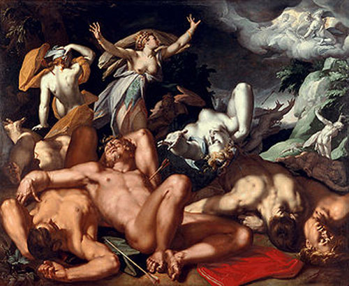 Figlia di Tantalo, re di Lidia, Niobe andò sposa ad Anfione figlio di Giove e re di Tebe da cui ebbe, secondo quanto racconta Ovidio, sette figli e sette figlie. Insuperbitasi per la sua fortuna di madre, ebbe l'imprudenza di ridere di Latona che aveva generato solo due figli, Apollo e Diana, i quali non tardarono a punire l'offesa recata alla madre uccidendo coi loro archi tutti i figli di Niobe. Secondo un’altra versione se ne salvarono due, Cloride e Amicla (nel dipinto di Abraham Bloemart - 1591, Copenaghen, Statens Museum for Kunst - assiste disperata alla morte dei figli; foto del titolo; ndr). Il mito è già ricordato nell’Iliade, ne parla Saffo e Dante lo inserisce nel XII canto del Purgatorio, come esempio di ira punita. Perdute, invece, le tragedie di Eschilo e Sofocle, ad esso ispirate.