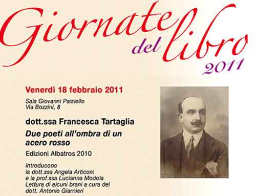 Clicca per Ingrandire Proseguono le “Giornate Mondiali del Libro” organizzate dal Club Unesco “Federico II” di Lucera per avvicinare, soprattutto i più giovani, al piacere della lettura. Venerdì prossimo 18 febbraio, alle 18.30, nella Sala Paisiello di Lucera (via Bozzini, 8, adiacenze piazza Duomo), Francesca Tartaglia presenta il romanzo "Due poeti all’ombra di un acero rosso. Vera storia di un INsuccesso" (Edizioni Albatros 2010). Introducono Lucianna Modola e Angela Articoni. Leggerà alcuni brani il giornalista Antonio Giarnieri. Al termine, Elvira Calabrìa, presidente dell’Associazione “Amici della Musica Giovanni Paisiello” guiderà i presenti in una breve visita alla storica dimora di Umberto Bozzini.