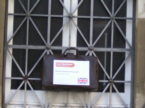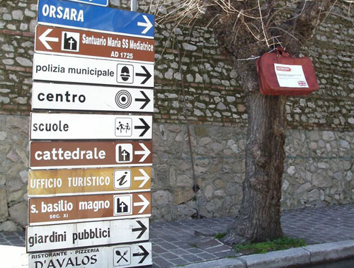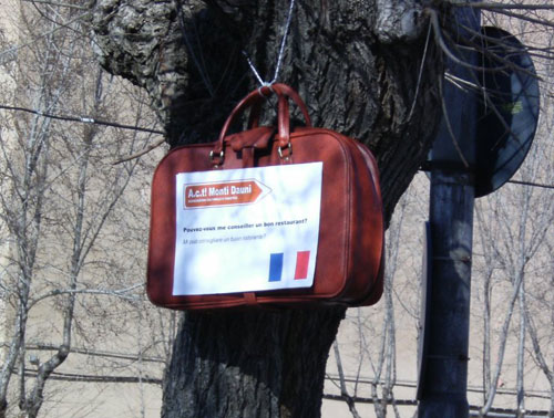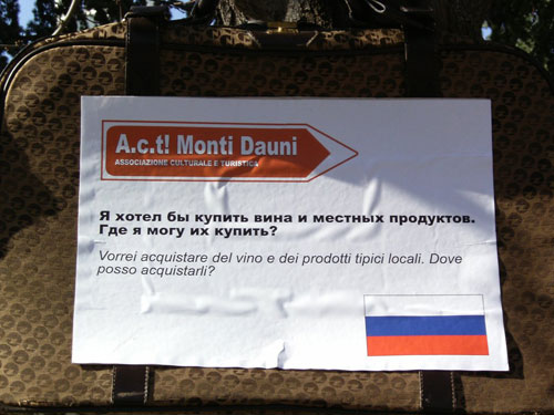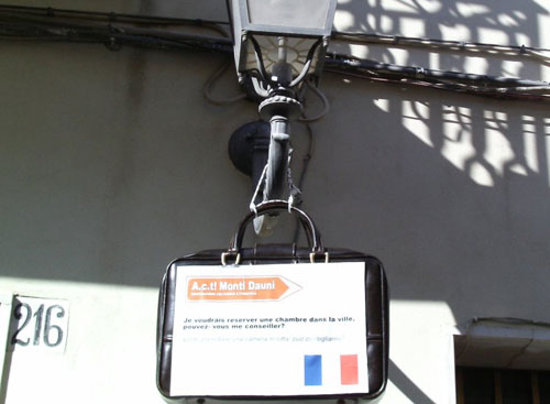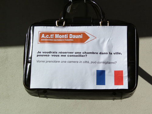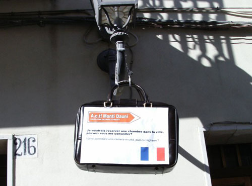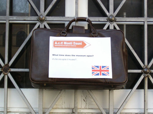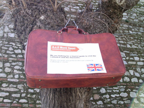 Clicca per Ingrandire La settimana a Troja è iniziata con una strana novità: in ogni angolo della città vi sono inusuali valigie appese agli alberi, ai lampioni e ai semafori (vedi foto di seguito). Su ogni valigia vi sono bandierine di paesi stranieri e frasi in lingue diverse e la classica freccia marrone che indica le località turistiche. Cos’è questa eccentrica novità? E’ la campagna di promozione di “A.c.t! Monti Dauni - Associazione Culturale & Turistica”, un modo originale di presentare il progetto vincitore del programma regionale “Principi Attivi” che si propone di rilanciare cultura e turismo a Troja e nei Monti Dauni attraverso l’attivazione di servizi turistici e la realizzazione di eventi culturali.
