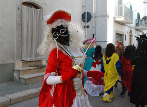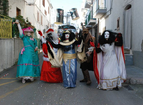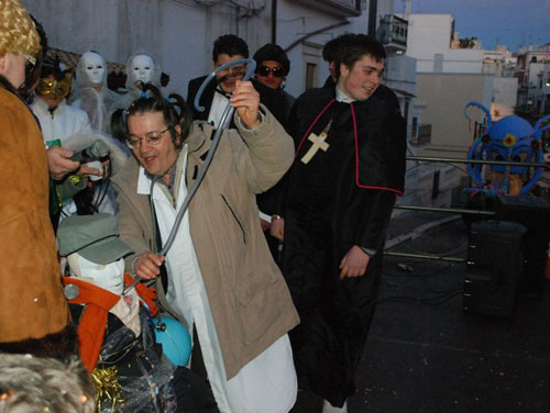“Nel carnevale antico - prosegue, - durante l’operazione la gente che si ammassava intorno cantava lo stornello ‘Il piede del porco’. L’operazione veniva ripetuta per le strade del paese, accompagnata da urla, frastuono e risate degli astanti. All’imbrunire, l’asino con il suo carico e tutto il seguito si dirigevano (e si dirigono tuttora) verso il Castello, dove il fantoccio di Carnevale veniva gettato in mare dalla Rupe antistante. I Carnevali appesi nei vicoli, invece, venivano bruciati. Le alte fiamme illuminavano la notte, segnando l’avvento della Quaresima.”