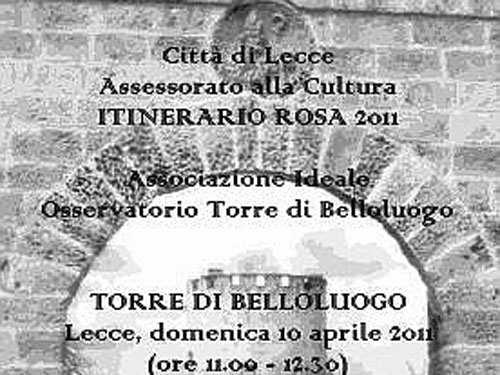 Clicca per Ingrandire Domenica 10 aprile, dalle 11 alle 12.30, la Città di Lecce (Assessorato alla Cultura) e l’Associazione Ideale "Annamaria Massari-Antonio L. Verri-Marianna Casto-Giorgio Di Lecce-Luigi Mura"-Osservatorio “Torre di Belloluogo” promuovono nell'ambito dei percorsi al femminile di "Itinerario Rosa 2011" una iniziativa culturale ambientata in uno dei monumenti architettonici di maggior pregio del territorio: la Torre di Belloluogo, nel nome di Maria d’Enghien, straordinaria figura femminile antesignana del Rinascimento nella città di Lecce e nel Salento. L’evento si attuerà