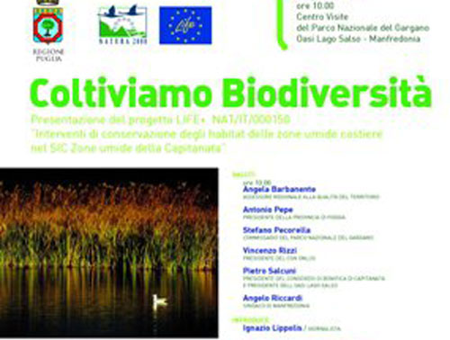 CONVEGNO “COLTIVIAMO BIODIVERSITÀ” = Domani venerdì 8 aprile, all’Oasi Lago Salso di Manfredonia presentazione del progetto LIFE+NAT/IT/000150 “Interventi di conservazione degli habitat delle zone umide costiere nel Sic (Sito di Interesse Comunitario; ndr) Zone umide della Capitanata” (foto 1 sotto, focus della locandina; ndr). L’area delle zone umide sipontine nel golfo di Manfredonia rappresenta uno dei sistemi ambientali di maggior valore e ricchezza naturalistica in Italia e nel bacino del Mediterraneo, con un costante trend di crescita del numero di specie nidificanti. Il convegno, oltre a presentare le azioni del progetto, vuole fare il punto della situazione circa la loro conservazione. A margine, saranno sottoscritti i protocolli d’intesa per l’attuazione del progetto e all'inizio la liberazione di sessanta esemplari di Falco grillaio.