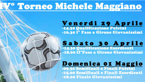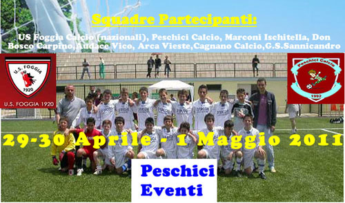 Clicca per Ingrandire Dal 29 aprile al 1° maggio prossimi si terrà a Peschici il 4° Torneo “Michele Maggiano”, torneo giovanile scolastico categorie Pulcini-Esordienti-Giovanissimi, organizzato dalla Società Asd Peschici Calcio in collaborazione col team US Foggia, e autorizzato dalla Fgci Puglia. Vi prenderanno parte 400 piccoli atleti della provincia provenienti da San Nicandro, Ischitella, Vico del Gargano, Vieste, Rodi, Peschici, Carpino, con la partecipazione dei giovanissimi nazionali del'U.S. Foggia Calcio e sarà un test importante per la selezione alle giovanili dello stesso Foggia Calcio nella stagione prossima.
