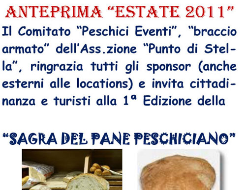 Giusto, la sagra. Il Comitato “Peschici Eventi”, da noi definito “braccio armato” della Associazione Culturale “Punto di Stella” nelle locandine che spaziano su mezzo Gargano, ha voluto farsi conoscere al volgo - dopo un paio di iniziative andate a buon fine - con una delle manifestazioni più contadine, più schiette, più rurali, più ruspanti che ci siano: la sagra! Termine che richiama le feste popolari, tradizionali, quelle impreziosite da fiere e mercati finalizzati alla valorizzazione soprattutto dei prodotti tipici locali. E quale prodotto tipico locale più del pane casereccio?