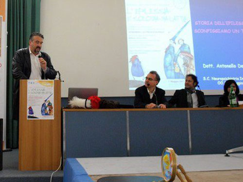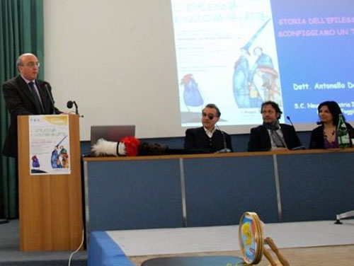 Introduce i "lavori" il presidente dell'Ordine dei Medici che dà il via al necessario momento di "rigorosa" ma puntuale e soprattutto masticata e resa fruibile informazione scientifica su questa malattia di cui spesso ci si vergogna: è lo staff del reparto di Neuropsichiatria Infantile guidato dal primario dott. Marzocco a condurre magistralmente la tavola rotonda. Lo stridore e suadente suono dal sapore medievale di un violino, e non solo, per le musiche di un altro medico, Nino De Bellis, la voce dell'attrice foggiana Mirna Colecchia (foto 5) fanno da contorno alla rappresentazione della fiaba, scritta da un altro medico, "Un bambino, la strega e un mago", ossia il giorno in cui una bambina incontra la strega Epilessia e grazie a un mago (un giovane medico dal camice bianco) se ne libera (foto 6-7).