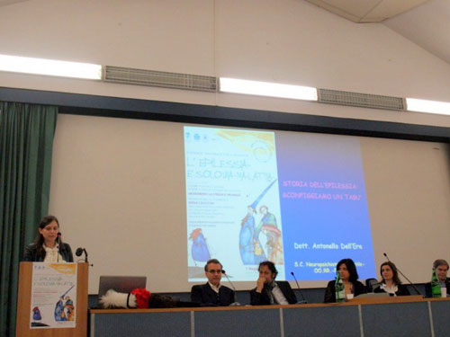 Applausi conditi da tanta commozione ai mimi della compagnia Kolè, alle coreografie di Tiziana Zappatore e alla piccola Alessia che ha interpretato Sara la bambina affetta da epilessia. Si apre la discussione e mamme, insegnanti, medici, in tanti salgono sul podio dell'oratore a testimoniare il proprio approccio con questa malattia. Dulcis in fundo, una sorpresa non preannunciata, i Synapsis (foto 8), un coro sui generis composto da giovani dottoresse capeggiate da Antonello Dell'Era (foto 3, al centro), anch'egli giovane medico del reparto di NPI, con libere intepretazioni di canzoni dai ritmi coinvolgenti.