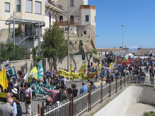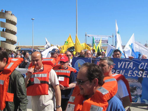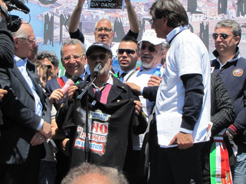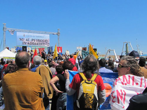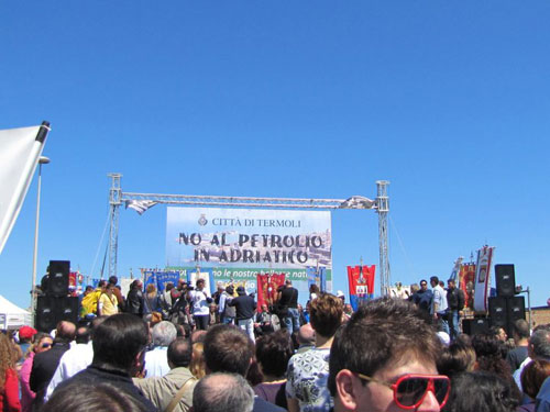 La dichiarazione della nostra piccolina ha fatto da contraltare e bilanciato da sola il coacervo delle dichiarazioni di tutte le istituzioni presenti. Europarlamentari, deputati, rappresentanti delle Regioni Abruzzo-Molise-Puglia, sindaci, assessori, consiglieri, responsabili di associazioni ambientaliste, si sono susseguiti sul palco eretto nel piazzale del porto termolese. “Gran cerimoniere” il peschiciano Raffaele Vigilante che, insieme al commissario dell’Azienda di Promozione Turistica di Foggia, Nicola Vascello, ha progettato la grande iniziativa contro le introspezioni petrolifere a poche miglia dalle Isole Tremiti autorizzata alla Petroceltic dal ministro all’Ambiente Stefania Prestigiacomo.
