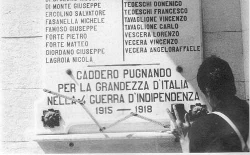 Andrea è ora davanti al Municipio, dove c’è il monumento dei caduti della Grande Guerra (foto 10) che «caddero pugnando per la grandezza d’Italia nella guerra di indipendenza 1915-18». Sembra indicare, con tre dita della mano, gli anni della guerra: tre anni per 39 peschiciani morti, “ufficiali”, senza contare i dispersi. Sulla lapide (trasferita ora all’interno della Casa Comunale; ndr) campeggia, nella parte superiore non ripresa dalla foto; ndr) la scritta: «E’ bello è divino per l’uomo onorato morire per la patria, morir da soldato».