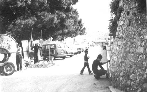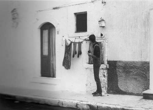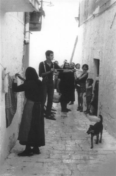 Nelle foto si riconosce una signora, “Sina ‘a roscia” (Teresina la rossa), intenta a spazzare il marciapiede di via Colombo davanti alla sua casa immortalata da molti turisti perché sul muro sono sospesi due barattoli di latta (buatte), a mo’ di vaso, sempre fioriti di basilico e gerani (anche questa immagine oggi non c’è più; ndr). La donna guarda allarmata il ragazzo che li sta “misurando”.