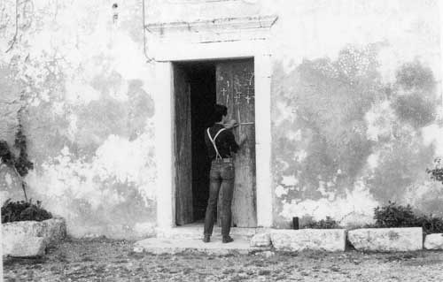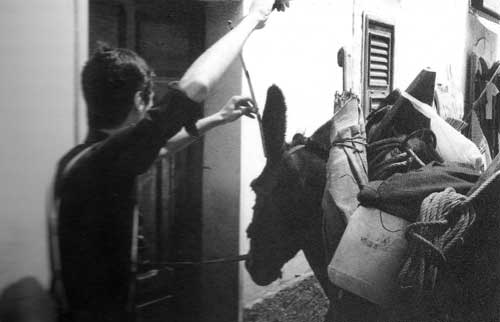 Paz non demorde nella sua ardua impresa: misura in orizzontale e in verticale un asinello parcheggiato davanti a una casa. Ne centimetra le lunghe orecchie (foto 3, sotto). Prosegue nel borgo antico, misura uno degli “anelli” posti sui muri, dove vengono attaccate le briglie dei quadrupedi (foto 4, sotto), le calze stese ad asciugare davanti a una cisterna (foto 5). Dopo squadra il portale di una tipica casa di Peschici (foto 6), di fronte allo sguardo stupito di una vecchietta. Imperterrito, con un sigaro stretto fra i denti, continua a misurare luoghi, muri e stipiti, inferriate, scalinate, gradini, panni stesi al sole nelle strette vie del centro storico.