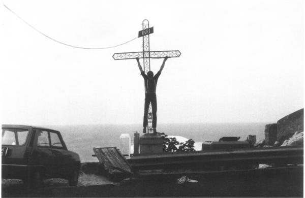 Alcuni “scatti” ci colpiscono per la loro singolarità densa di significati. Andrea è fermo davanti alla grande croce piantata negli anni Cinquanta dai passionisti di padre Ernesto in località Borghetto a Mare, di fronte alla “Curva del Guardaro” (artigiano che “creava” i basti dei quadrupedi; ndr). Vi sale e, mimetizzando per un attimo il metro sotto un braccio della croce, simula il Cristo. Crocifisso di fronte al mare stagliato all’orizzonte (foto 8).