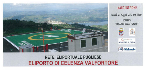 Clicca per Ingrandire Sarà inaugurato domani, venerdì 27 maggio, l’eliporto di Celenza Valfortore. La cerimonia comincerà alle 10 al Relais San Pietro. Al taglio del nastro, previsto per le 11, interverranno Nichi Vendola (presidente Regione Puglia), Antonio Pepe (presidente Provincia di Foggia), Ruggiero Castrignanò (direttore generale Asl Foggia), Antonio Nunziante (prefetto della provincia di Foggia), Vincenzo Russo (procuratore capo Tribubale di Foggia), Maria Rosaria Maiorino (questore di Foggia) e il vescovo mons. Domenico Cornacchia. Alle 12.50 Guglielmo Minervini, assessore alle Infrastrutture Strategiche della Regione Puglia, illustrerà le caratteristiche del “Sistema Eliportuale Pugliese” mentre un’ora più tardi si terrà la dimostrazione di operazioni in volo degli elicotteri.