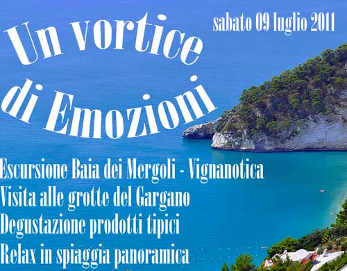 Clicca per Ingrandire Il primo grande evento estivo degli Itinerari Daunia TuR denominato “Gargano… vortice d’emozioni” ci attende sabato 9 luglio (foto del titolo – focus locandina; ndr). Un itinerario naturalistico costiero alla scoperta delle Baie e Grotte (foto 1 sotto) più suggestive del Gargano. L’Associazione Daunia TuR propone un cocktail d’emozioni attraverso un’escursione naturalistica guidata lungo il tratto costiero Baia dei Mergoli-Vignanotica. Il sentiero (foto 2), di notevole valore paesaggistico, si sviluppa a mezzacosta a strapiombo sul mare ed è ricoperto da una lussureggiante macchia mediterranea, alternata a pineta, lecceta e uliveti secolari.