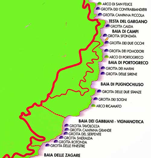 ore 10,30: giro turistico delle Grotte del Gargano da Baia di Pugnochiuso a Baia delle Zagare con bagno nelle più belle baie e calette della zona del Gargano meridionale;