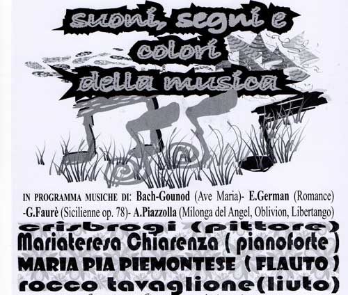 Clicca per Ingrandire Domenica 11 settembre dalle 21 in poi, nella “Dimora di Charme - Palazzo della Torre” (Via Colombo 23, Centro storico di Peschici) avrà luogo un evento nell’ambito della rassegna culturale estiva 2011: Lidia Croce presenta le grafiche del giovane artista senese Cris Brogi, elette a rappresentare il rapinoso mondo della musica. Nello spazio dell’incontro, il patio dell’antico palazzo cinquecentesco di donna Grazia Marino della Torre, sono in programma musiche dal vivo di Bach-Gounod (Ave Maria), E. German (Romance), G. Faurè (Sicilienne op.78), A. Piazzolla (Milonga del Angel, Oblivion, Libertango).