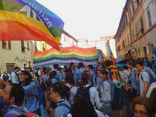 Mai vista tanta gente tutta insieme, un serpentone interminabile di 200mila persone che ha visto sfilare associazioni di ogni genere, dai ‘noTav’ ai centri sociali, dagli scout agli scalatori, Legambiente, Wwf e altri, oltre alle tante persone che singolarmente o in gruppo hanno voluto aderire e gridare in modo silenzioso il diritto alla pace e alla fratellanza dei popoli. Al centro del serpentone si è sviluppata una ‘ola’, promossa da una associazione settentrionale, al ritmo di una frase: “Questa è l’onda della non violenza”. Scout ovunque e da tutto il territorio nazionale, compresi gli scout di Lampedusa con una delegazione di profughi. Balli e danze hanno accompagnato il fiume di gente multicolorato. Una esperienza indimenticabile, hanno detto in tanti, e in tanti si sono dati appuntamento al prossimo anno.