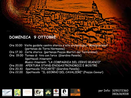 Domenica 9 ottobre “Suoni Sapori e Colori” comincerà alle 10 con le visite guidate e l’escursione al sito archeologico di Montecorvino; alle 17.30 uno dei momenti più attesi e solenni: il corteo storico che partirà da Piazza Martiri del Terrorismo; alle 19, il giardino pensile sarà l’arena del torneo di tiro con l’arco mentre alla stessa ora prenderà il via lo spettacolo itinerante di “La compagnia del cervo bianco”; alle 20, con l’apertura di mostre e stand enogastronomici, la festa continuerà con la performance di “Focarte” e più tardi con “Il Giorno del Cavaliere”.