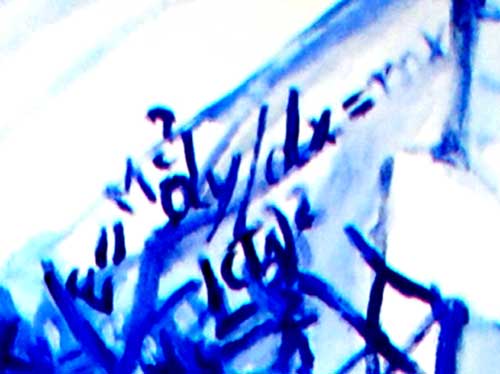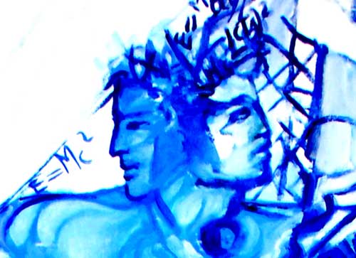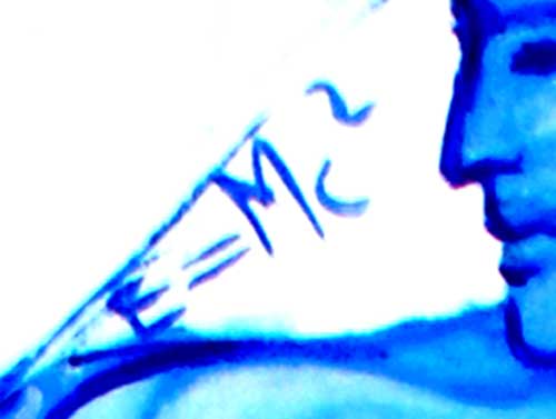 6. Didattica delle scienze = Se non è stato agevole identificare l’esistenza del timone e quindi comprenderne la funzione nel contesto del quadro, non vi diciamo quanto sia stato difficile scoprire - quindi comprendere - la presenza di alcune formule - una chicca che la Croce predilige - nella parte più alta del dipinto, al di sopra delle teste, quasi a significare il prodotto della mente umana. Così abbiamo individuato sulla spalla destra del protagonista principale (foto 9) la famosissima formula di Einstein (E = mc2 dove ‘E’ rappresenta l'energia totale meccanica di un corpo, ‘m’ la massa in chilogrammi di quel corpo a riposo e ‘c’ la velocità della luce), formula oggi quasi messa in discussione dalla scoperta che esisterebbe qualcosa di più veloce della luce, i neutrini. La teoria del fisico, scienziato e matematico tedesco è chiamata “della relatività” e, senza scendere nello specifico, possiamo riassumerne il concetto generale dicendo che: tutto è relativo, anche la decisione di partire o restare del nostro personaggio, fuggire o rimanere, scegliere fra l’incerto e il certo, lasciarsi adulare da una circe o accettare il più sicuro e comodo rifugio della fanciulla rimasta sulla banchina.
