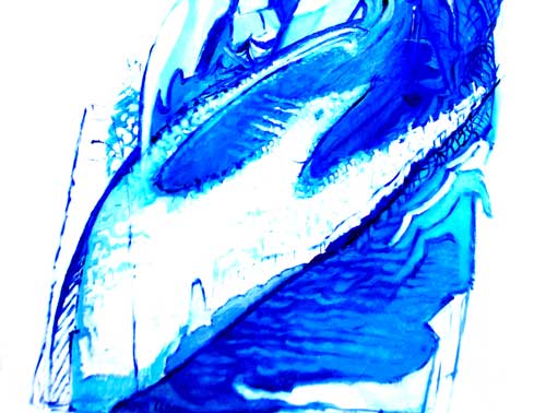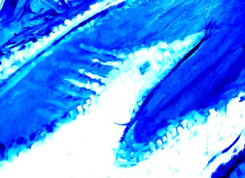 Innanzitutto, utilizzando i mezzi che la tecnoinformatica ci mette a disposizione, computer e software annessi, abbiamo sezionato - letteralmente - la tela, ovviamente una sua immagine, in due parti, staccando la superiore dall’inferiore. E cominciamo proprio da questa (foto 3), forse - ma non è detto - la più semplice e meno ricca di peculiarità e segnalazioni. Cosa si vede. Ciascuno di noi può rispondere in maniera diversa. Succede così nel figurativo, dove si rappresentano immagini riconoscibili del mondo intorno a noi a volte fedeli e accurate, a volte altamente distorte. Riguardo alla tela che abbiamo davanti ci troviamo a mezza strada: l’immagine generale è facilmente riconoscibile ma allo stesso tempo distorta. Diremo poi perché.