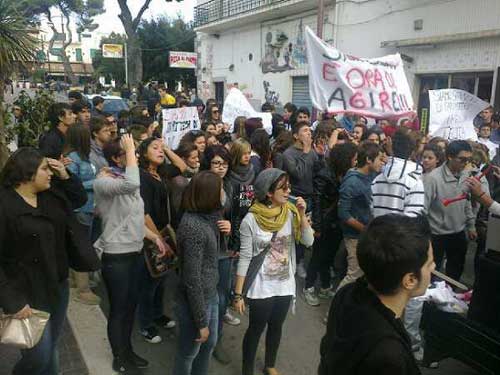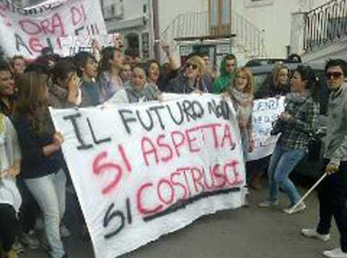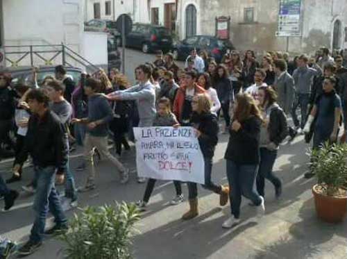 Il corteo, coreografato da scritte e musica popolare, ha messo in mostra tutta la “rabbia” degli studenti, uniti in unico urlo: “Vogliamo la scuola”, capace di ammutolire l'intero paese. Proprio quel paese che attende da anni il “famoso” istituto, quel paese stanco di continue lotte contro gli organi istituzionali, quel paese stufo di numerose e più o meno “false” promesse, quel paese che ha giocato tutte le sue carte per dare un futuro ai propri figli, quel paese che continua nella dura lotta grazie alla forza continua e duratura dei Suoi studenti.