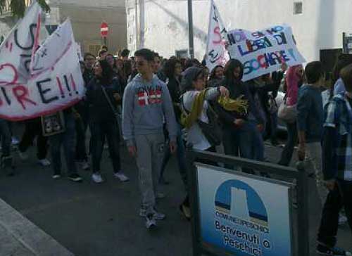 Clicca per Ingrandire “Siamo stanchi, è ora di agire...” E gli studenti sono scesi in piazza! Con lo slogan "Il futuro non si aspetta, si costruisce", gli allievi dei due istituti superiori di Peschici (Liceo scientifico “Fazzini” e ITT) hanno attraversato le vie della cittadina garganica partendo, alle 10, dall’ex campo sportivo per sollecitare le autorità preposte affinché inizino al più presto i lavori del nuovo edificio scolastico per il quale è stata già espletata la gara d'appalto e individuata la ditta.