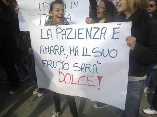 “Basta, ormai non ci crediamo più! Eppure noi non vogliamo arrenderci, siamo qui per dimostrare che i ragazzi di Peschici esistono e hanno il diritto e il dovere di istruirsi in una vera e propria scuola... Una scuola degna di essere chiamata tale”. E' il commento, strozzato in gola da irritazione ed emozione, di uno studente del Fazzini, condiviso da compagni e colleghi che, a ritmo di taranta e danze popolari, continuano imperterriti a diffondere il loro messaggio in ogni angolo del Paese sotto gli occhi stupiti di familiari e Autorità civili e militari.