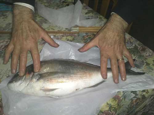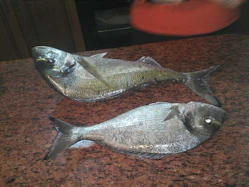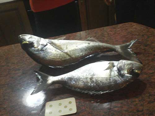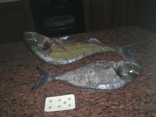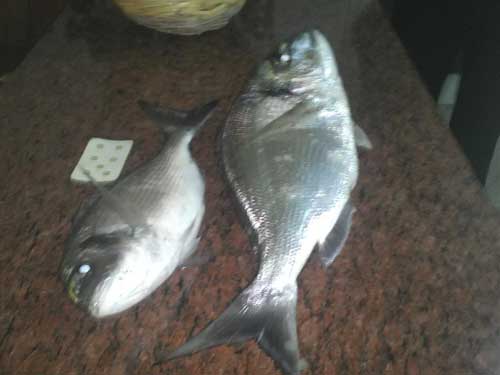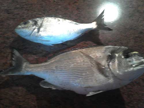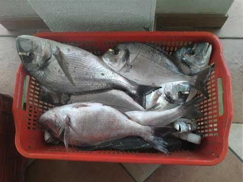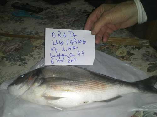 Alla fine (e qui, la pioggia vien giù a cascate!), si ritrova con un gran numero di “vavose” (i famosi “ghiozzi” tanto appetiti dai veneziani, ma non dovutamente apprezzati da noi), due “capimazzi” (anguille di circa mezzo chilo, di sesso maschile), due “capitoni” (di ben oltre il mezzo chilo e più vicini al chilo, se non di più - non li si è potuti pesare, perché lasciati in vasca a vivere ancora prima di trasferirli in surgelatore per le feste di fine-anno, il cui sesso è cambiato ed è diventato femminile), due spigole del peso di circa 700-800 grammi cadauna, un altro bel numero di orate, più o meno di pari peso (foto da 1 a 5) e fra queste una signora regina di ben 44 cm di lunghezza, da muso a coda, e del notevole peso di millecinquecento grammi (foto 6-7), finita poi, come dono, nel mio surgelatore!