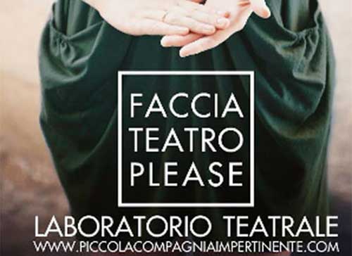 Clicca per Ingrandire Un invito impertinente a mettersi in gioco. E’ il laboratorio "Faccia teatro, please!" promosso e organizzato dalla Piccola compagnia impertinente di Foggia che, a partire dal prossimo 5 dicembre, inaugura la prima classe della sua “officina laboratoriale”. “Faccia teatro, please” è uno spazio espressivo pensato per chi si avvicina al teatro desideroso di iniziare un percorso difficile e al tempo stesso esaltante. Uno spazio anche fisico, perché la sua sede (che verrà inaugurata prossimamente) sarà pensata fondamentalmente per chi farà laboratorio, con un’ampia zona palco.